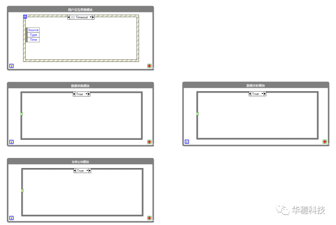 以一个数据采集测试系统为例,我们设计程序的时候一般会将程序分为上图中的高内聚、低耦合的四个模块,分别为:用户界面模块、数据采集模块、数据分析模块、文件I/O模块。